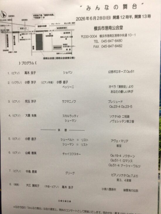 毎年我々講師仲間のコンサート みんなの舞台(年2回、6・11月に行う)プログラムが、今回も夏の会のために、出来上がりました。前回(昨年11/29)の舞台では、仕事の都合で出演出来なかった方が多く、結局会場を半日(午後枠)のみ使用というかたちで、開催しました。なんとか今回は、ほぼほぼいつものメンバーが揃って、参加出来る状態になり、正直ほっとしました。